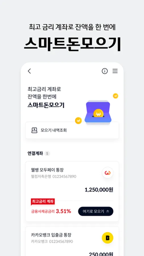 · 웰뱅에서는 출금할 계좌카드를 꾹 누른 후 입금할 계좌카드 끌어오면 이체 완료! 쭉 이체!