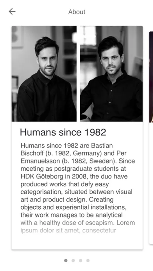 Humans since 1982 are Bastian Bischoff (b. 1982, Germany) and Per Emanuelsson (b. 1982, Sweden). Since meeting as postgraduate students at HDK Göteborg in 2008, the duo have produced works that defy easy categorisation, situated between visual art and product design. Creating objects and experiential installations, their work manages to be analytical with a healthy dose of escapism.