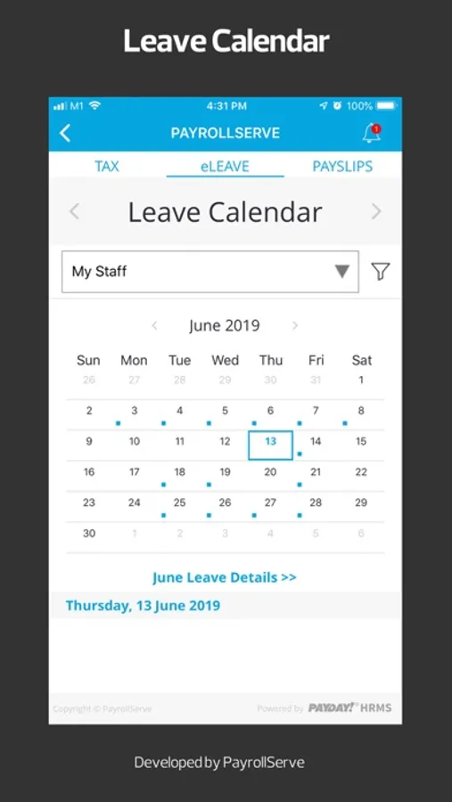 PayDay! HRMS, developed by PayrollServe, is a secure mobile application that allows employees to view their itemised payslips and income tax information, view leave balance, apply leave and leave calendar conveniently anytime from anywhere. And approvers can view all staff leave calendar for better approval decisions and approve leave on the go.