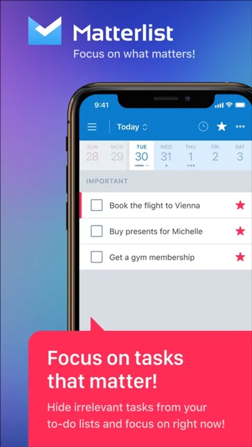 SAFE DEADLINES. When you postpone a task, it disappears from your Today list, but its due date stays unchanged. Matterlist doesn’t shift Due Dates as other to-do list apps do, so your deadlines remain safe.