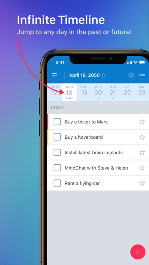 INFINITE TIMELINE. If a task has a date, be it tomorrow, next Monday, or sometime in 2050, jump to that date and put your task there. When that day comes, you’ll see this task on your Today list. Go back to any date in the past to see what you accomplished on that day.
