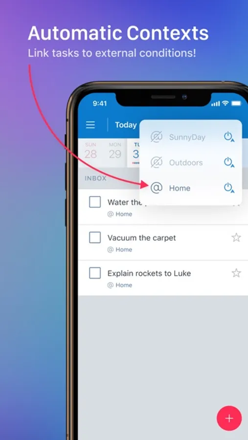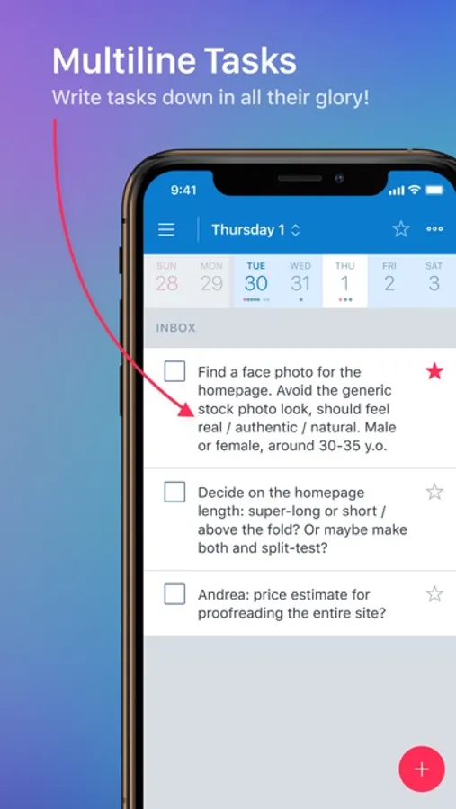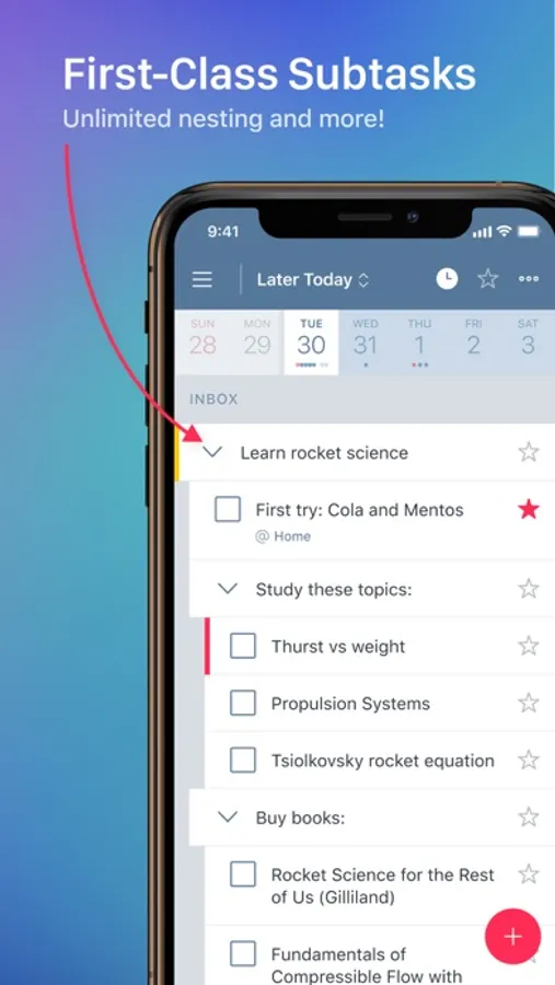 HIERARCHICAL SUBTASKS. Divide a bigger task into smaller ones that you can do right now. Use unlimited nesting levels to represent any complex task you might have. Work with a subtask like any other task: assign contexts, add notes, create due dates, and postpone them whenever you like.