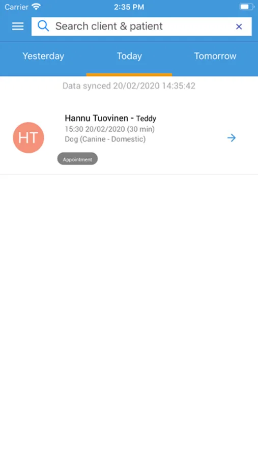Provet Cloud mobile is a tool which enables you to access your veterinary appointments and the information of clients and patients connected to the appointments. The information is always for the day of the last connection and the preceding and following days.