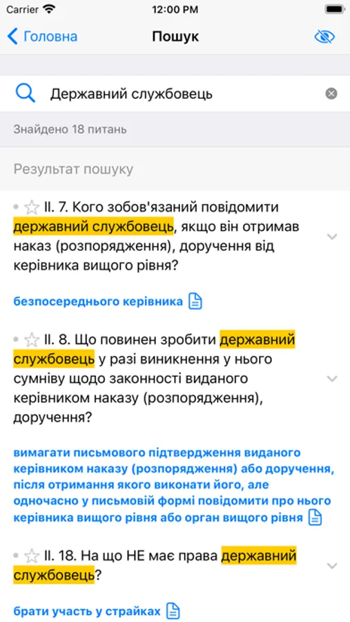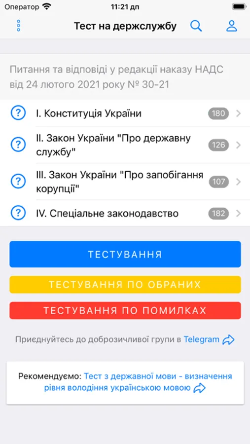 Даний додаток містить актуальний перелік усіх тестових питань з варіантами відповідей, що затверджено наказом Національного агентства України з питань державної служби від 30 серпня 2017 року № 178 (у редакції наказу НАДС від 24 лютого 2021 року № 30-21). Також додано 3 питання, яких немає в переліку, але вони зустрічаються на іспиті.