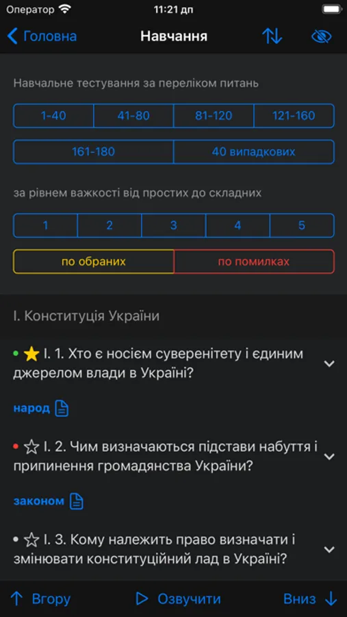 На сторінці навчання можна увімкнути озвучення тексту, що завдяки синтезу мовлення дозволяє читати вголос тестові питання та відповіді. Це дає можливість прослуховувати та запам'ятовувати тести, припустимо, будучи в навушниках у громадському транспорті по дорозі на роботу або просто на прогулянці чи пробіжці.