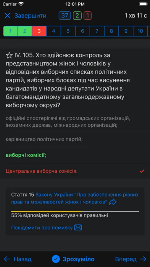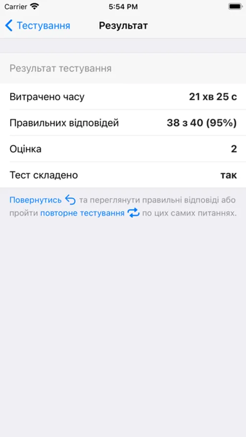 Завдяки додатку можна самостійно пройти пробне тестування довільну кількість разів для підготовки до конкурсного проходження тестів. Тестові 40 питань формуються випадково з кожного розділу і таким чином щоб не повторювались із попередніх тестувань, поки не будуть розглянуті всі. Крім того, питання в яких були допущені помилки у відповідях фіксуються і саме по них додатково можна пройти тестування повторно для самоперевірки.