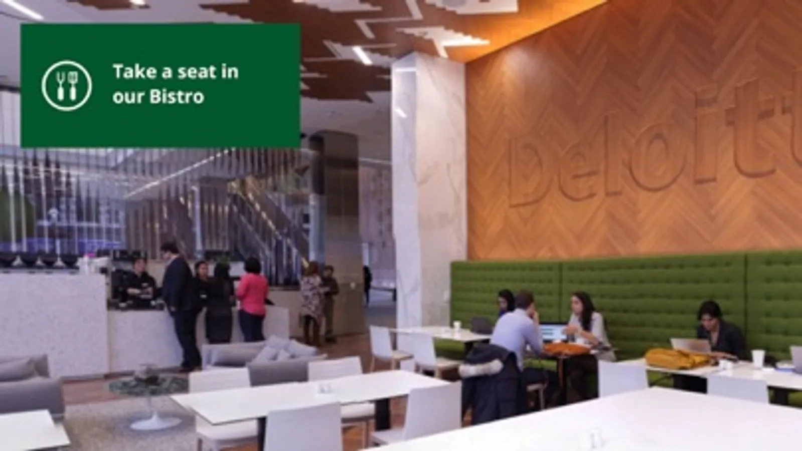 • Immerse yourself in our innovative spaces: Choose from Recharge, Greenhouse, Bistro 1858, Deloitte University, working areas, and more.