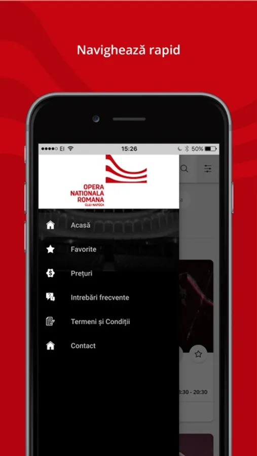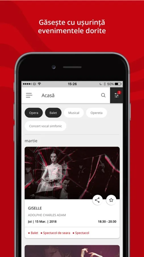Homepage-ul aplicației aduce reprezentațiile programate în ordine cronologică, oferind însă și posibilitatea vizualizării acestora în funcție de gen (operă, balet, musical, operetă sau concert vocal-simfonic). În cazul unor reprezentații multiple ale aceleiași producții, acestea vor deveni extrem de vizibile, în ordonare cronologică.
