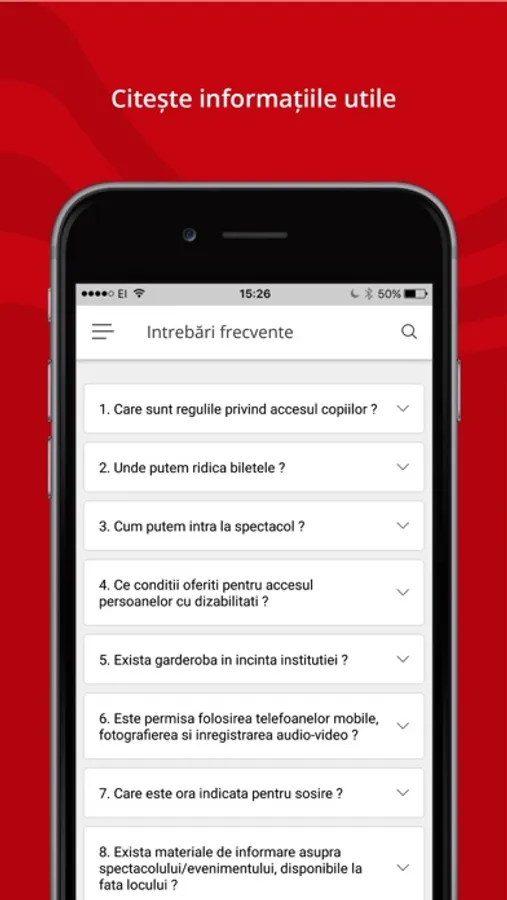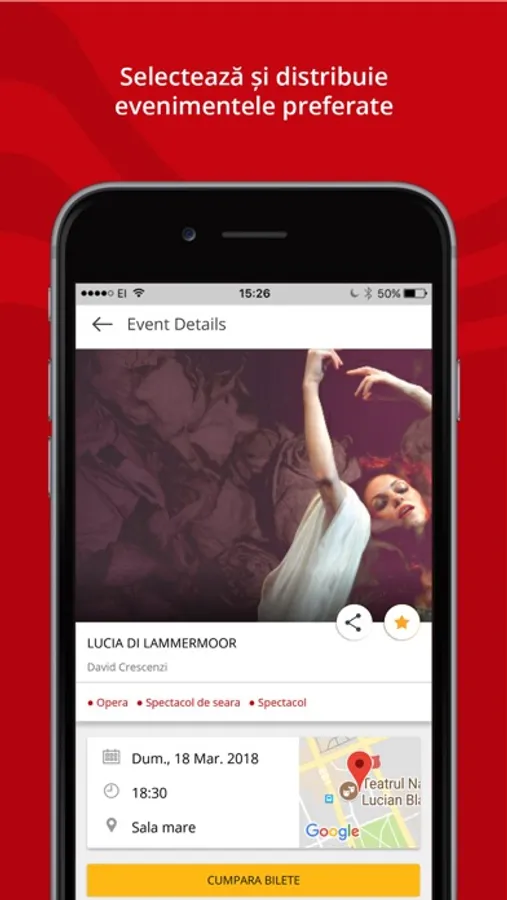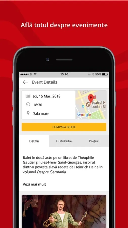 O altă funcție importantă și de mare ajutor, mai ales pentru participanții la spectacol care vin din afara orașului, este cea de localizare și ghidare prin Google Maps către adresa la care are loc evenimentul artistic. Planul hărții și indicațiile de orientare pot fi activate cu ușurință, printr-un simplu click. De asemenea, link-ul către planul sălii, pentru achiziționarea de bilete, dar și prezența tabelului de prețuri practicate pentru respectivul spectacol oferă mijloacele ideale în stabilirea opțiunilor pentru un anumit tip de bilet sau loc. Totodată, fiind vorba de o anumită reprezentație, promovată și pe alte canale media precum Facebook, utilizatorul aplicației poate vizita, tot printr-un simplu click, evenimentul/ event-ul adiacent. Galeria foto aferentă fiecărei producții este, iarăși, la îndemână.