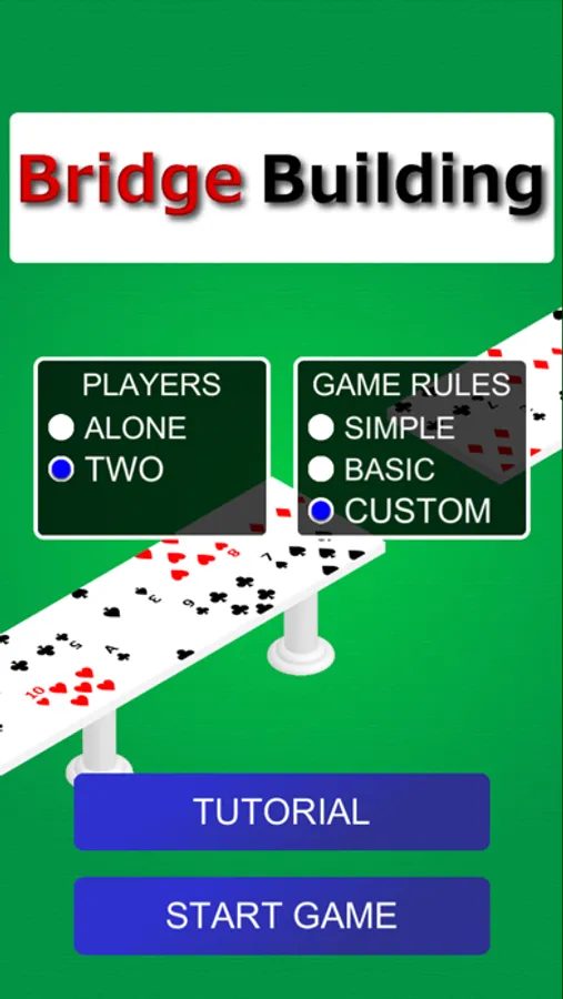 BridgeBuilding is a new type of card game that build a bridge by turning cards and connect the aces placed at the corner before the opponent.