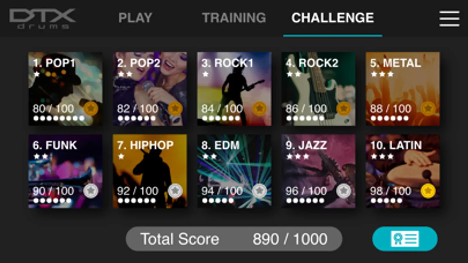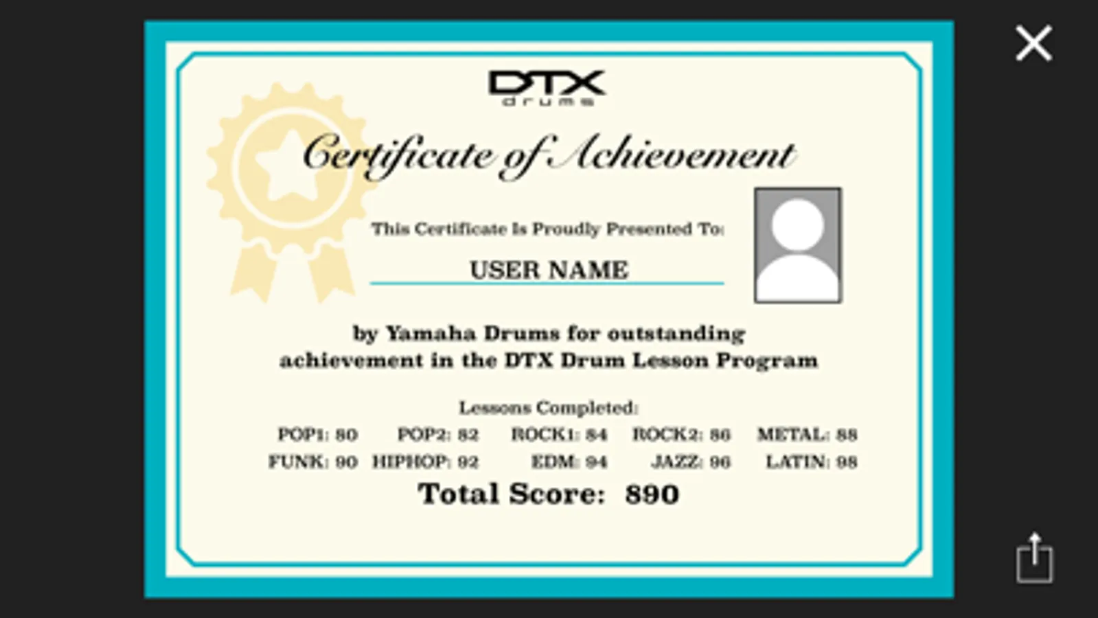 “Challenge Mode” is a new function on the DTX402 Touch that tests your skill. If you can play all 10 practice songs without making a mistake, you will receive a “Drummer’s Certificate” from the Yamaha DTX drum team that you can share via social media.