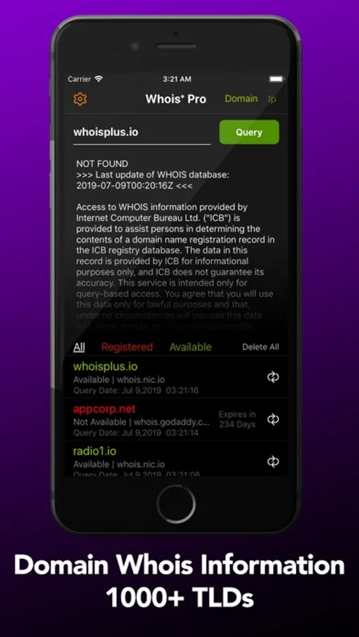 Whois+ is the most advanced WHOIS application. Whois+ lets you lookup more than 1000 domain extensions (including 100s new extensions such as .actor, .band, .clinic, .email... etc.) from thousands of whois databases.