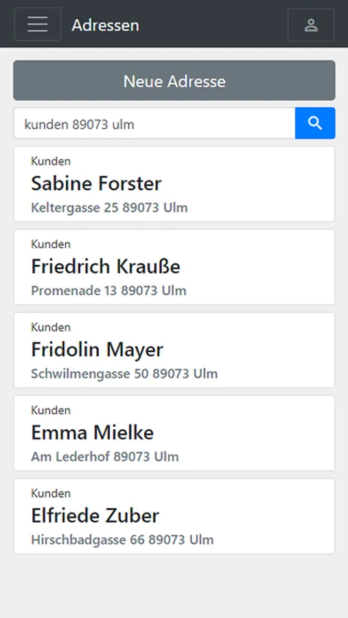 Nach dem Start der App gelangen Sie direkt zur Schnellsuche. Geben Sie bekannte Eckdaten der gesuchten Adresse in das Eingabefeld ein und starten Sie die Suche. Im Handumdrehen erhalten Sie eine übersichtliche Liste aller Treffer.