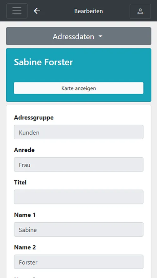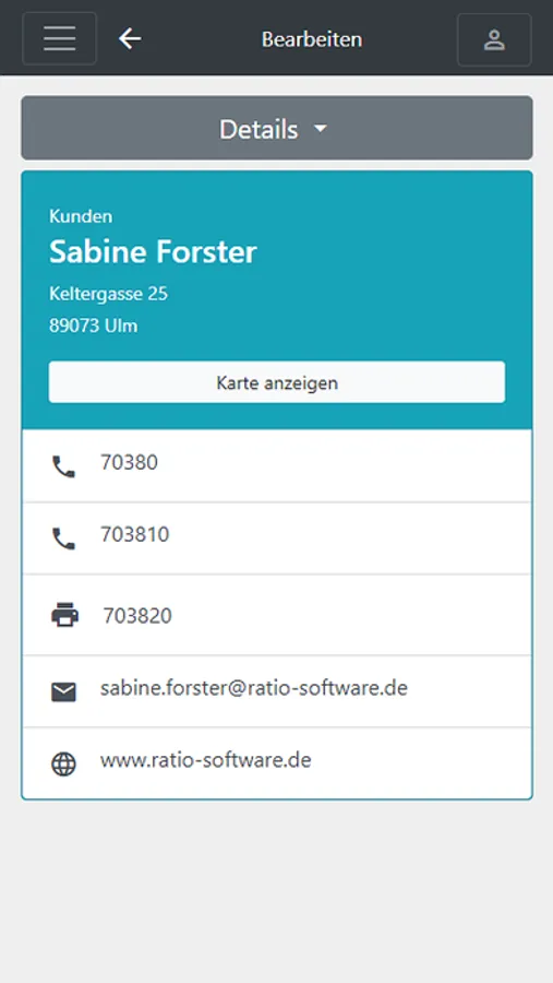 Klicken Sie auf ein Suchergebnis, um zur Detailansicht zu wechseln. Dort finden Sie alle wichtigen Informationen wie Name und Anschrift, Telefon- und Faxnummer, E-Mail- und Internet-Adresse sowie Bemerkung und weitere Kontaktpersonen. Alle Informationen können direkt in der App bearbeitet und in der Datenbank gespeichert werden.