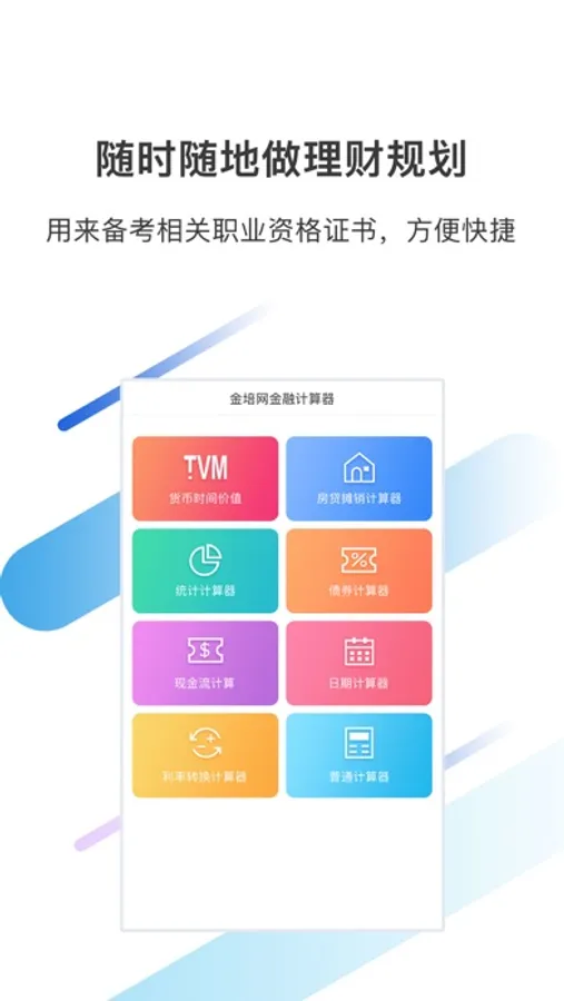 金培网专注于金融领域的职业资格及职业成长培训,结合银行从业、金融理财师的教学和考试特点,特推出移动端的理财计算工具,将金融计算器功能融入您的手机,可以用来随时随地做理财规划,也可以用来备考相关职业资格证书,方便快捷。