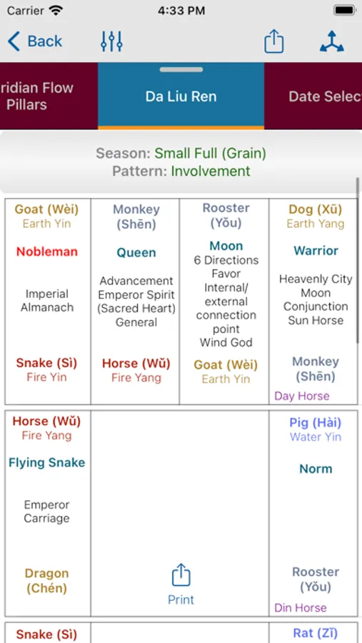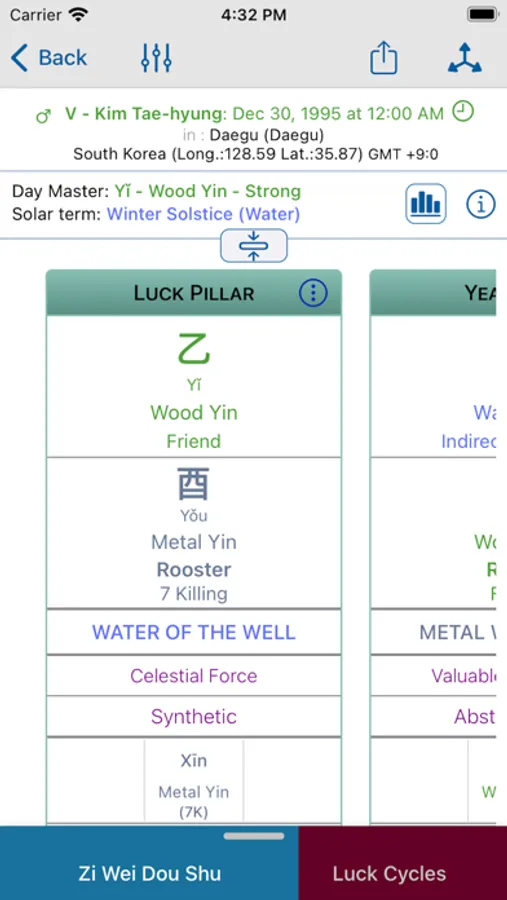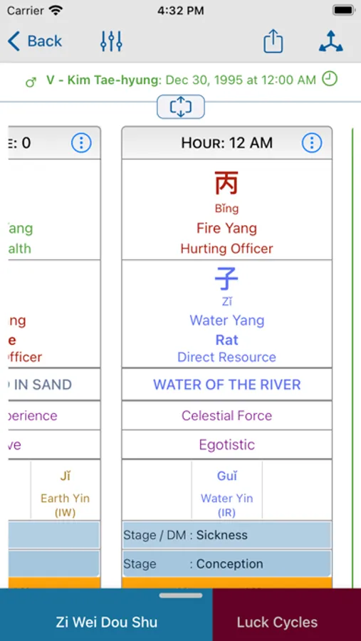 • 9 pillars calculation (year, month, day, hour, minute, Conception, Life, Conception Aura Pillar and Body Pillar)