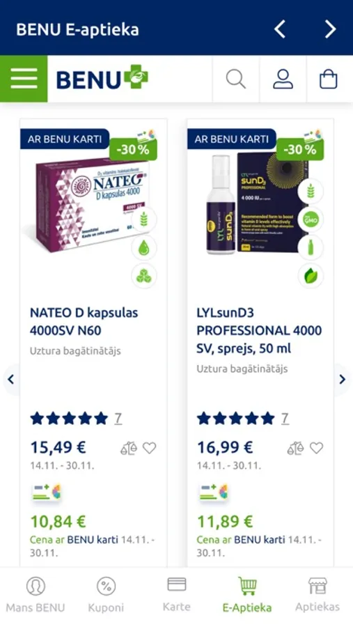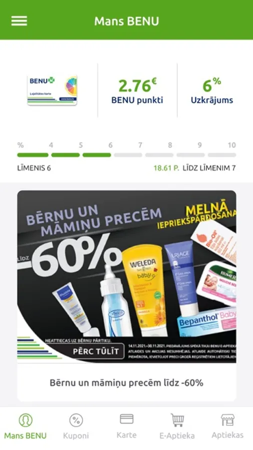 The application allows you to find BENU Pharmacies nearby and to take advantages of ongoing promotions and our personalised offers, as well as to make purchases in BENU e-pharmacy safely, conveniently, and profitably. Moreover, the application includes BENU loyalty card support and allows you to access the profile of BENU loyalty card holder. You are invited to check the balance of points, follow the tier and loyalty level that you have achieved. In addition, application allows you to view the purchase history in BENU Pharmacies.