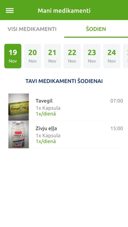 Tavai ērtībai aplikācija atbalsta arī medikamentu dozatoru, kas palīdzēs Tev ikdienā, nodrošinot ar vienkāršu rīku, lai kontrolētu Tev nozīmētā medikamenta uzņemšanu. Pēc tam, kad Tu ievadīsi medikamenta nosaukumu, devas un lietošanas instrukciju, Tu varēsi lietot atgādni un sekot savas tablešu kārbiņas saturam.