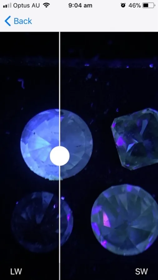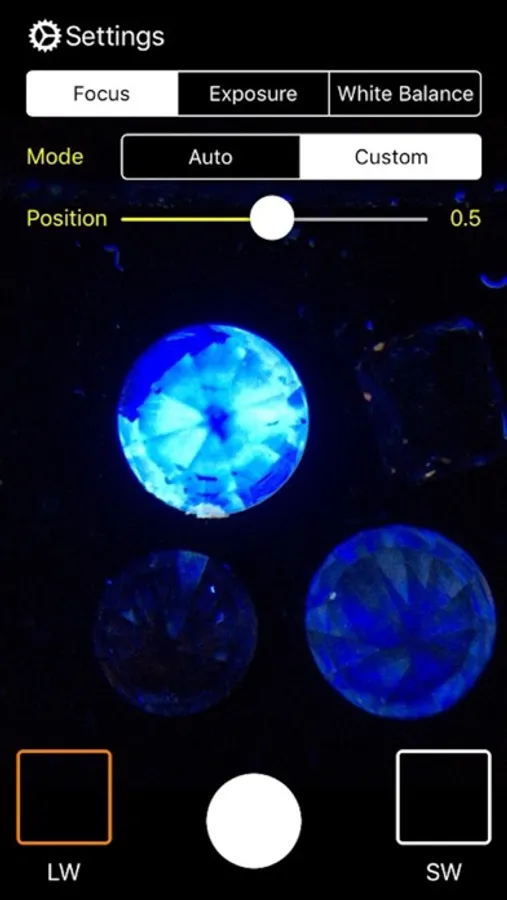 This app allows control of your smartphone camera, using the same settings for both short-wave ultra-violet (SWUV) and long-wave ultra-violet (LWUV) illuminations. The controlled settings are for exposure, ISO, color temperature and focus. The two images can then be compared either through alternating views or using a slider. Images with SW and LW labeling can be saved to your image gallery.