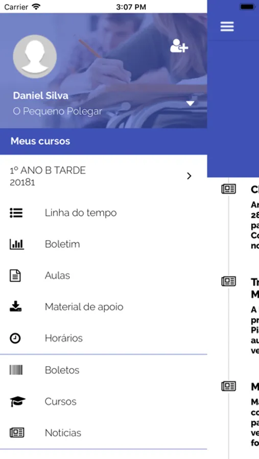 Você poderá acompanhar também os horários de aula, boletos de pagamento (apenas se você tiver esse acesso), além das notícias da instituição.