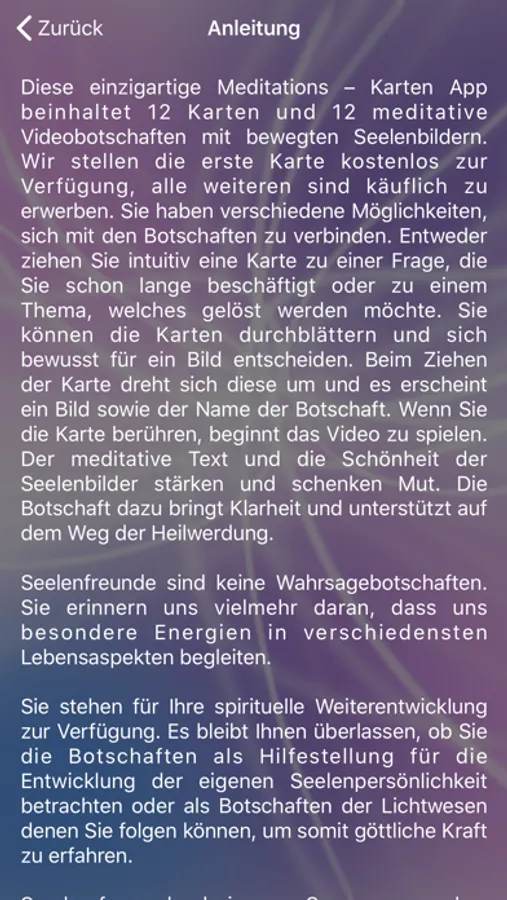 Diese einzigartige Meditations – Karten App beinhaltet 12 Karten und 12 meditative Videobotschaften mit bewegten Seelenbilder.