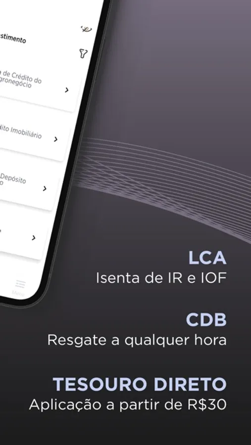 • LCA / LCI: Para você que deseja investir com baixo risco e ter rentabilidade maior que a poupança, investimentos para todos os objetivos com opções de liquidez a partir de 90 dias e proteção garantida pelo Fundo Garantidor de crédito, além de isenção de imposto de renda (IR) e IOF para pessoa física.