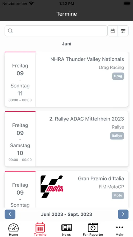 Egal ob Formel 1, WRC, Formel E, DTM, VLN, Nascar, DKM, MotoGP, WSBK, Drag-Racing, Speedway, Motocross, Motorrad-Biathlon, Trial, Quad, Kart, Tourensport, Slalom oder vieles mehr. Und mit der praktischen Importfunktion kannst du alle Termine mit einem klick ganz einfach in deinen Kalender importieren! Als Fan Reporter kannst du live von den Veranstaltungen berichten und auf unserer Motorsport-Karte findest du alle Rennstrecken und Motorsport Clubs.