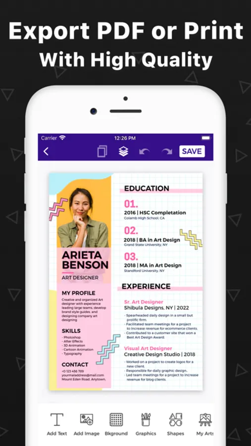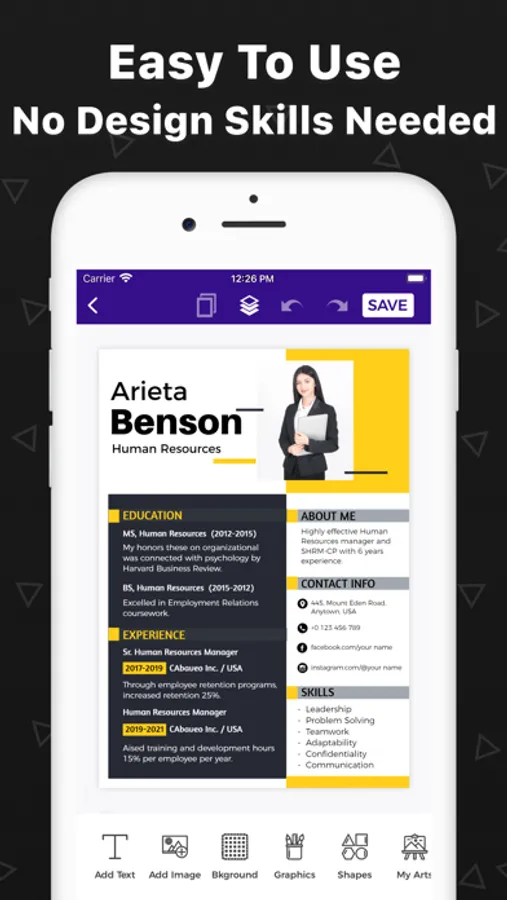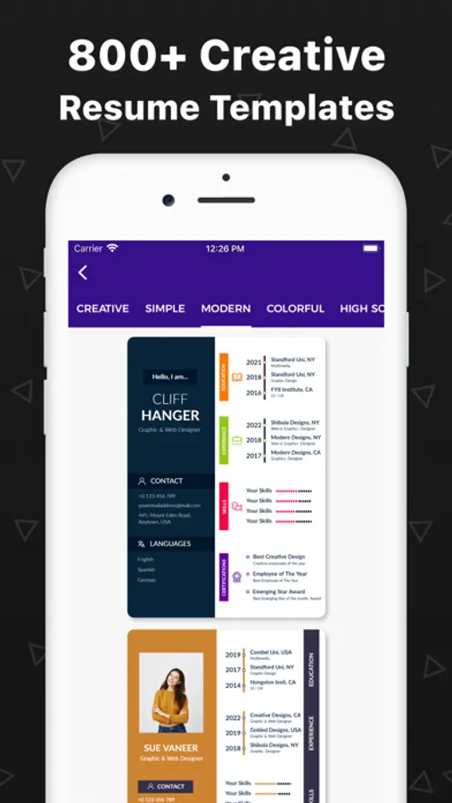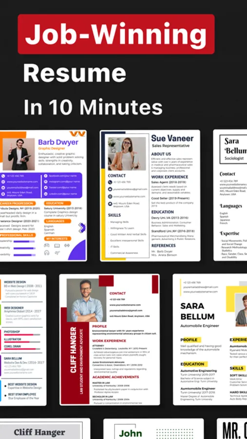 Design professional resumes in just a few taps with professional resume templates. Browse minimalist resume templates and pick one according to your needs. You can also add some shapes and gradient colors from the resume builder's collections to your minimalist resume.
