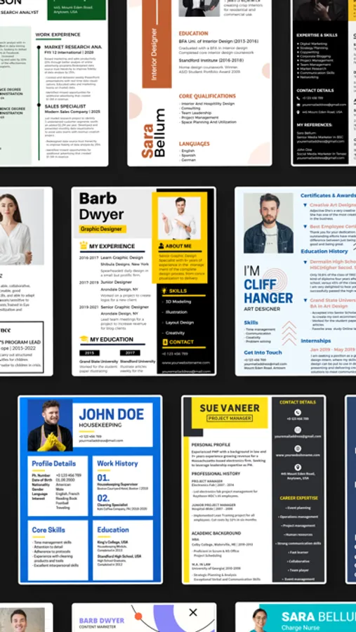 Create a resume using a huge library of pre-designed resume templates and different layouts crafted beautifully by our expert designers. Browse 100+ colorful resume templates to create a resume easily. Whether you are looking for a graphic designer, painter, fitness expert, or engineer our resume templates are perfect for you.