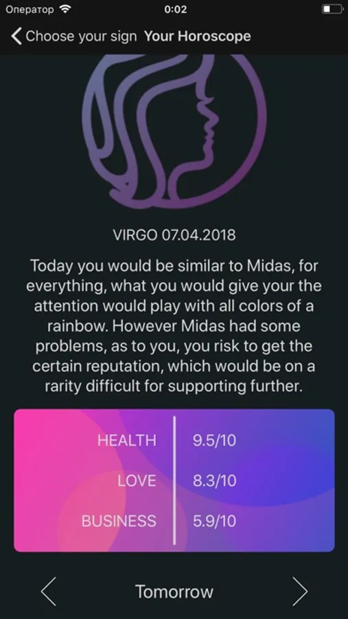 Business, Love, Erotic, Health etc. It collects data from different sources and based on new AI algorithms estimates daily health, business, love and other categories points from 0 to 10. In our first version we have two languages:
