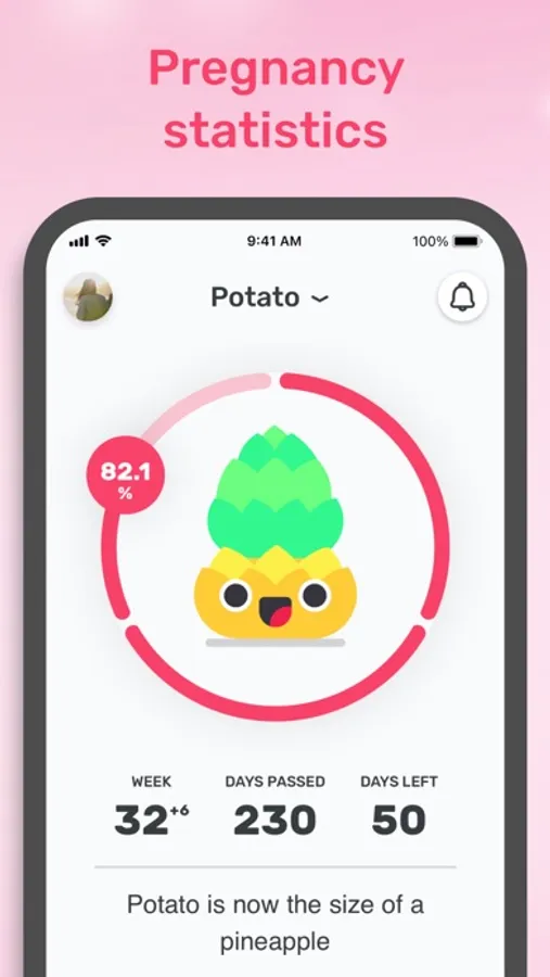 → Baby size tracker - the baby size is visualized week by week with interactive and cute fruits, animals, and other things