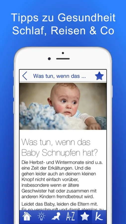Hat dein Baby Husten und Schnupfen oder planst du demnächst einen Strandausflug? Konkrete Fragen werden am besten über die Suchfunktion beantwortet. Oder du informierst dich direkt über den entsprechenden Alltagsbereich: Neben Ernährung, Gesundheit, Körperpflege und Schlaf gibt es auch viele clevere Ideen rund um die Themen Kleidung, Spiel und Reise.