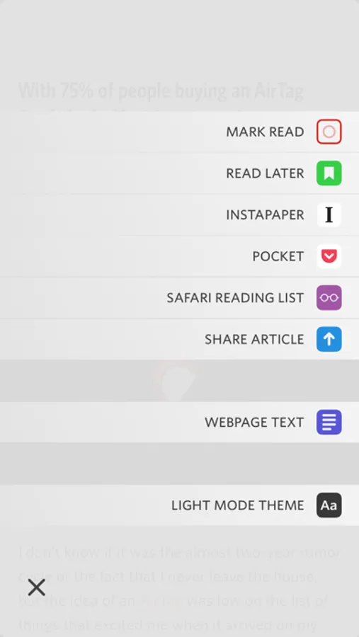 READ-LATER SERVICES: Unread provides native support for saving articles to Instapaper, Pinboard, Pocket, Raindrop.io, Readwise, and Safari Reading List. (Subscription required.)