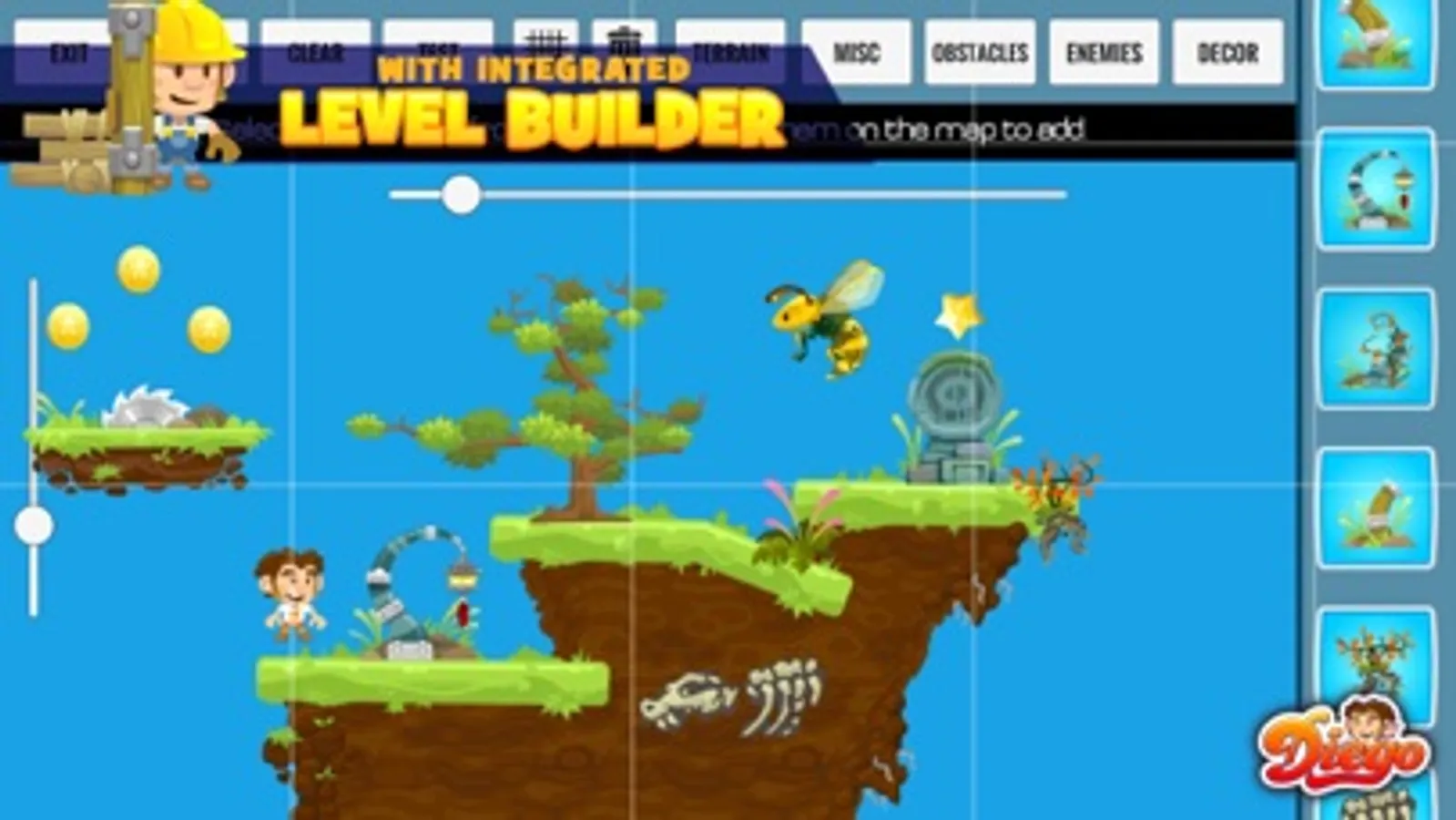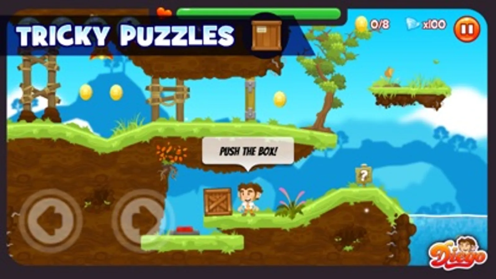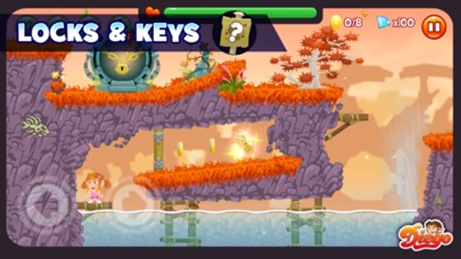 Diego - challenging, side scrolling classic platform game with many exciting features. Choose between two characters, play as a boy or girl. Jump between obstacles, defeat all monsters and try to collect as many coins and crystals as possible!