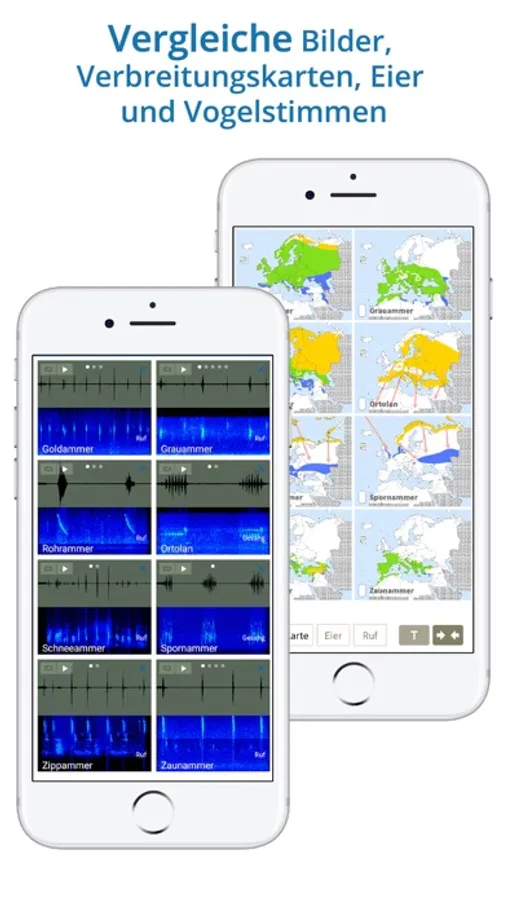 • Vergleichen-Funktion zum direkten Vergleich von Bildern, Verbreitungskarten, Eiern, und Vogelstimmen von bis zu 8 Arten auf dem iPhone und bis zu 16 Arten auf dem iPad