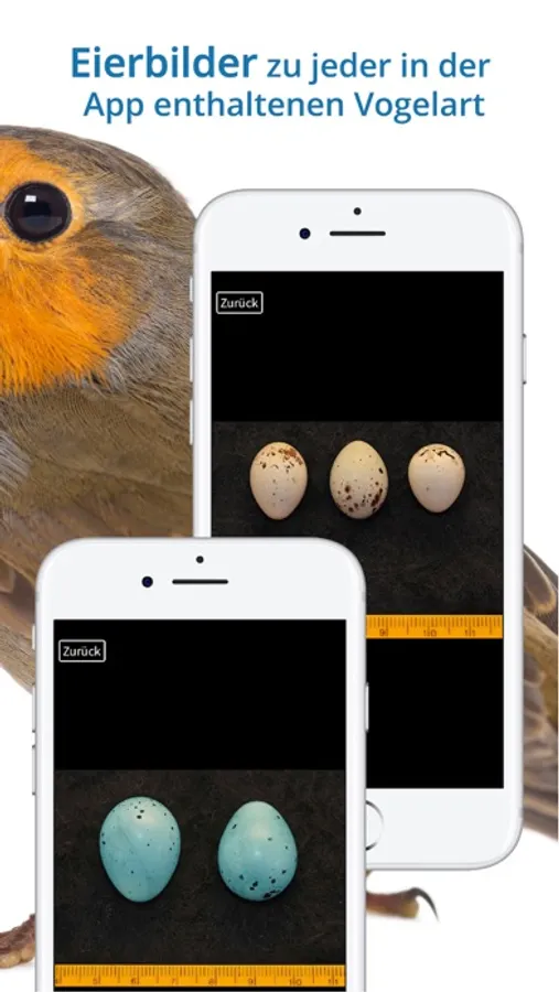 • Eierpaket mit Bildern von Eiern mit Maßstabsvergleich zu jeder in der App enthaltenen Vogelart 2,99 €