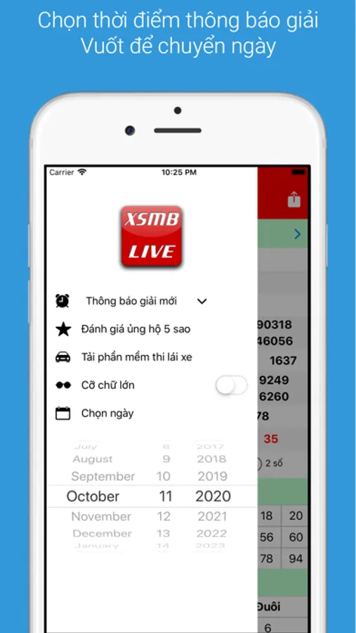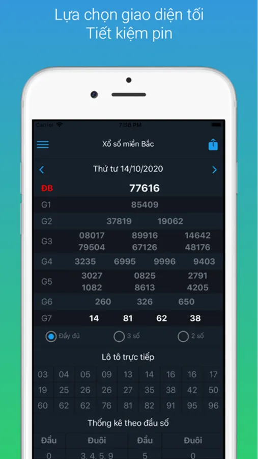 Giao diện đơn giản, dễ sử dụng. Cho phép xem kết quả xo so theo ngày, vuốt trái, vuốt phải để chuyển ngày. Hỗ trợ thống kê kết quả xổ số theo đầu số, tiện lợi hơn để theo dõi. Có thể chọn kích cỡ chữ và thời điểm nhận thông báo kết quả.