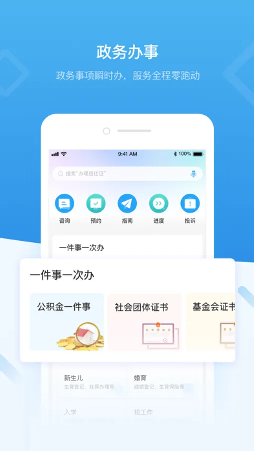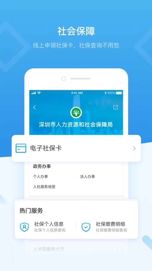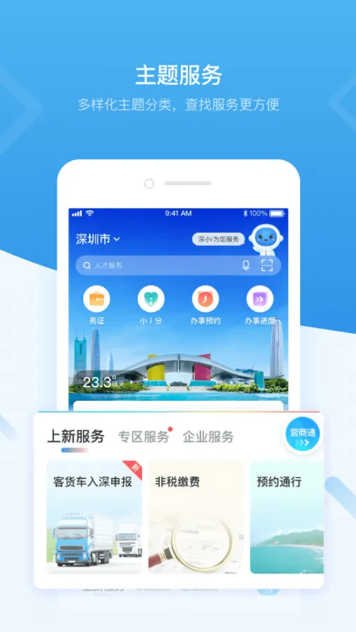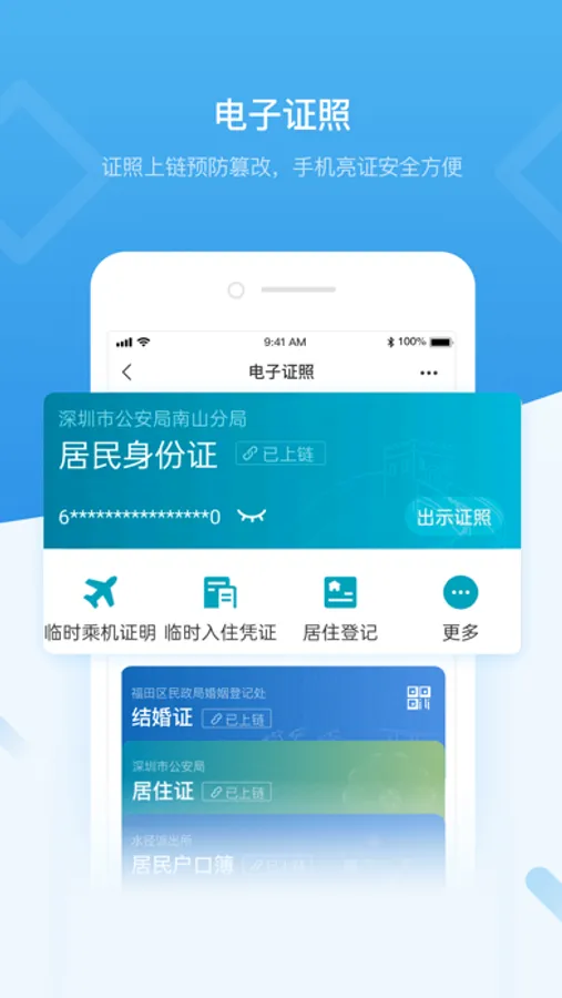 “i深圳”—深圳市统一政务服务APP,是深圳市政府打造的全市统一移动端政府服务平台,旨在为深圳市民和企业提供全方位政务和生活服务。目前已接入3个中直单位、43个市级单位、11个区级单位和19个国企单位共8000多项服务以及接入身份证、户口簿、居住证、结婚证等407类电子证照证明。