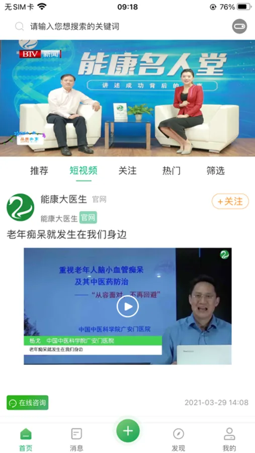 能康大医生是一个医生与医生之间的交流、学习、教育平台,同时也是医生与患者之间的健康交流平台。通过能康大医生,医生可以更好的展示自己、充实自己,患者可以学习到健康知识、得到健康指导,建立起医生与医生之间、医生与患者之间的链接,让医疗知识与信息流动起来。主要功能介绍:医师动态:医生发布的图文、视频形式的动态内容,可以分享生活点滴、分享工作心得、分享健康知识。医师培训:平台通过直播、点播等形式提供专业的学习资料,帮助医生更好的学习专业知识。患者教育:平台通过动态、直播、点播、短视频、患者群等功能,提供海量的健康知识,帮助患者更好的了解疾病、面对疾病。