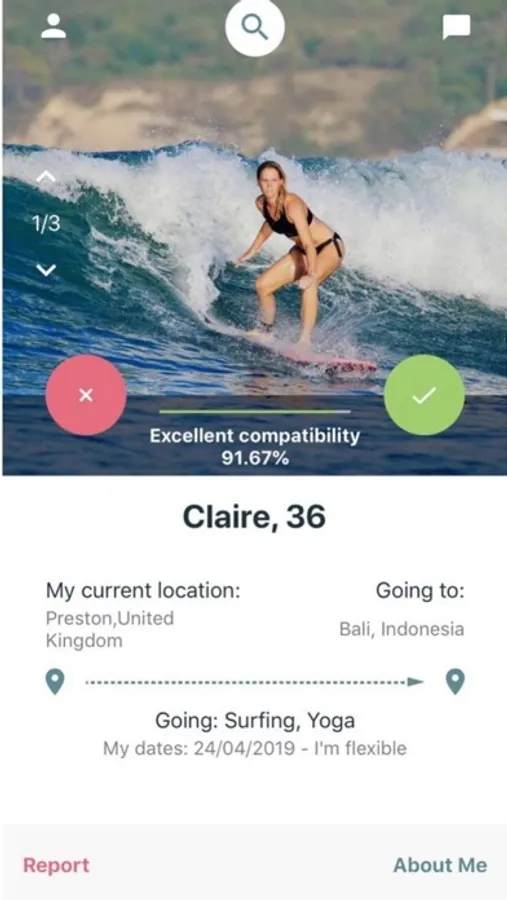 Whether you are going to the Swiss Alps, Bali, or Yosemite National Park, find a match, based on your exact destination, travel dates, planned activities and the age range of people you want to travel with. You will only see people, with at least 60% of similarity with your travel plans, and we even calculate the compatibility score between you and your travel buddy.
