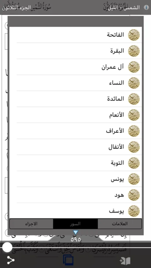 امكانية الوصول للسورة او الجزء المراد بالاختيار من القائمة