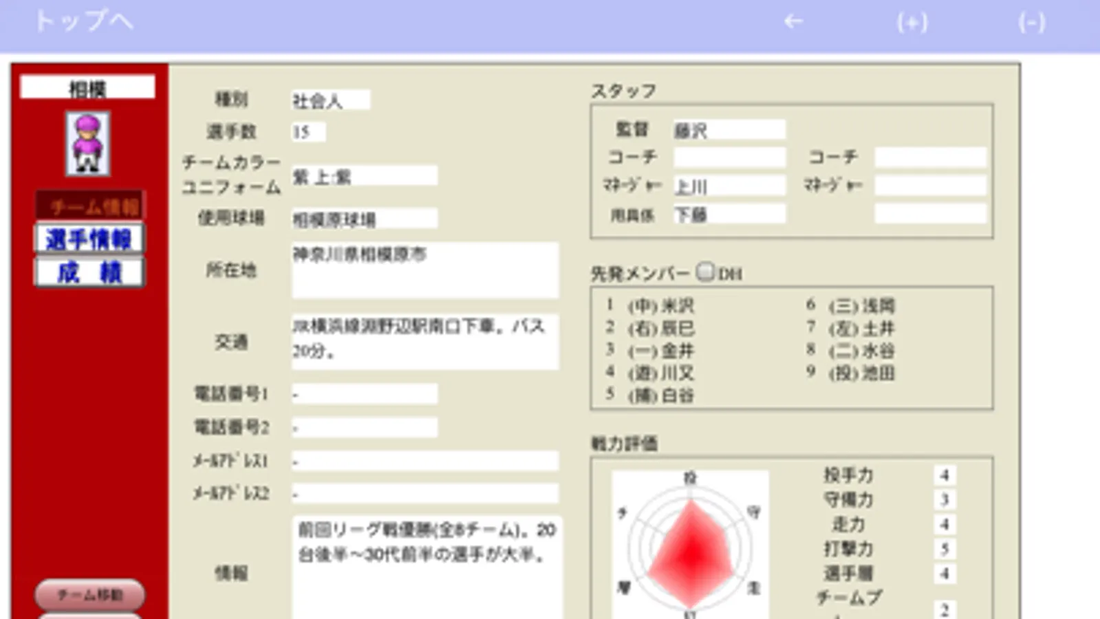インターネットサービス「野球簿net」で公開されている利用者様が作成したチームのデータ(PC版野球簿又はスマートフォンアプリ野球簿Tで作成)、弊社が公開しているプロ野球他のデータを、スマートフォンより閲覧するのに適したアプリです。