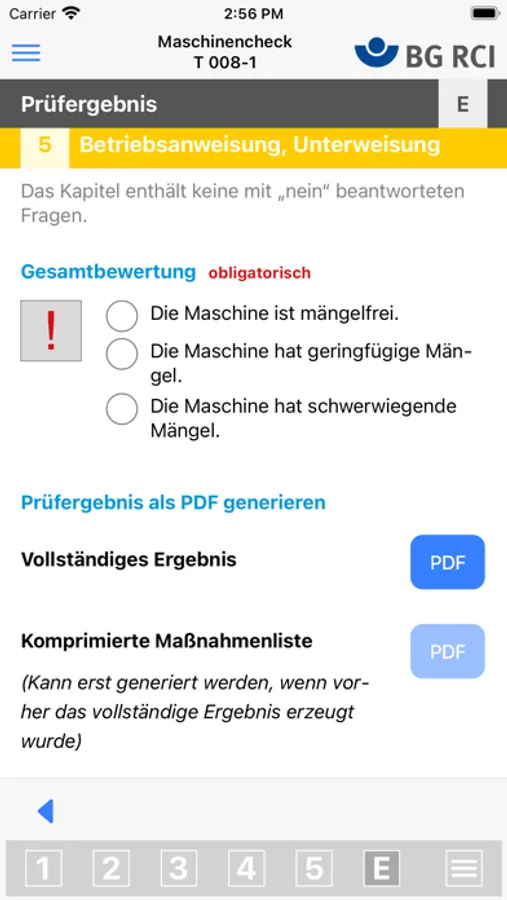 Das Ergebnisprotokoll der Überprüfung kann als mitgeltende Unterlage für Ihre Gefährdungsbeurteilung verwendet werden. Ferner kann der Unternehmer diese App verwenden, um die vorgeschriebene Prüfung vor erstmaliger Benutzung durchzuführen (§ 3 Abs. 1 der BetrSichV). Wir empfehlen, die Überprüfung mit dieser App als vertragsrechtlichen Bestandteil für die Übergabe vom Hersteller an den Betreiber zu verwenden.