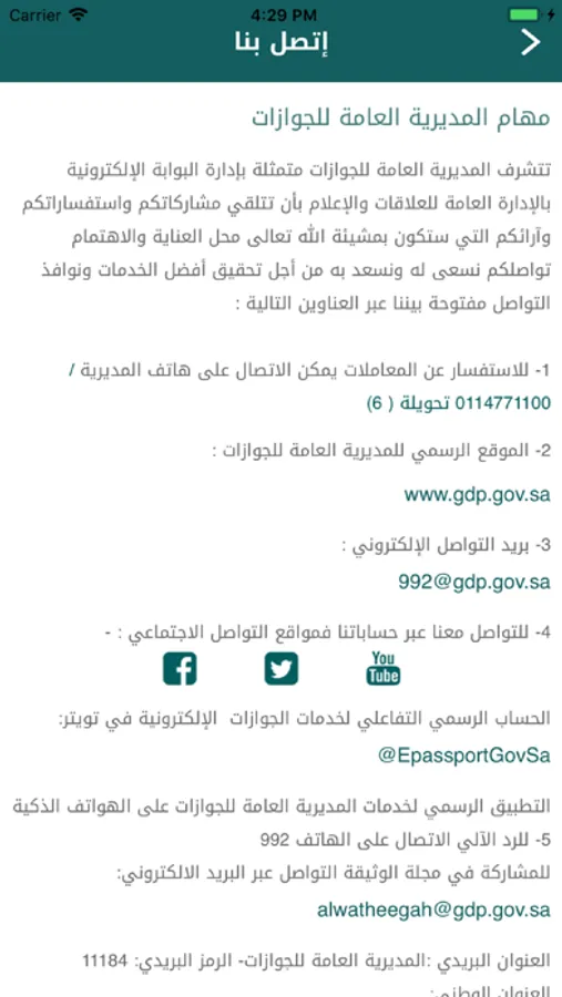 5- تسهيــل التـواصــل مع مســئولى الجـوازات السعــوديــة من خــلال قنـوات التواصل (فيسـبوك و تويتر و البريد الالكـتروني)