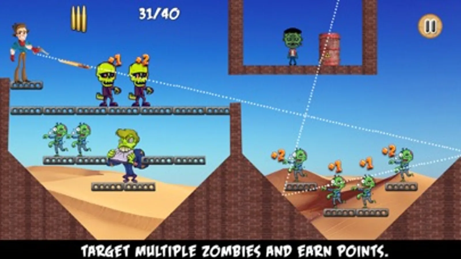 Zombie Shoot Off is a challenging shooting game for all. It is really difficult to survive in the zombieland. Meet the real challenge, save the world from the army of undead. Prove that you are a skilled zombie survivalist and shoot to kill all the zombies. Use your fire power and learn to ricochet to eliminate the zombie hordes. Be a real zombie slayer and clear out the walking dead that are coming to infect you. Be alert and responsive to survive zombies with the lesser number of bullets. Defend yourself and utilize your shooting skills in the shooting zombie games.