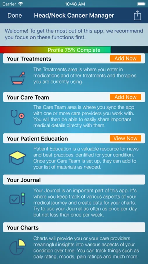 When you are living with Head and/or Neck Cancer , the Head/Neck Cancer Manager can help you manage the symptoms that affect you every day. Studies show that people with chronic diseases can positively affect their lives by using @Point of Care apps to track pain, medications, and more—giving a sense of control over their conditions.