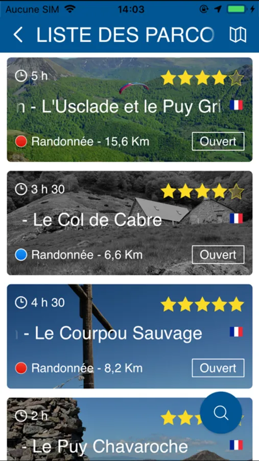 - Un choix d’itinéraires selon des critères simples : durée, niveau de difficulté, géolocalisation ;