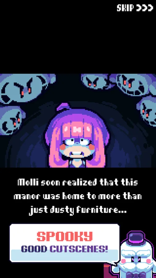 Play as Molli Pop as you fend off hordes of adorable ghosts in a twisted mansion forever haunted by the Phantom King! Power-up Molli with new flashlights and abilities as you level up - and team up with ghostly pups and other spectral creatures as you work together to clear the mansion of its sugar-craved evil!