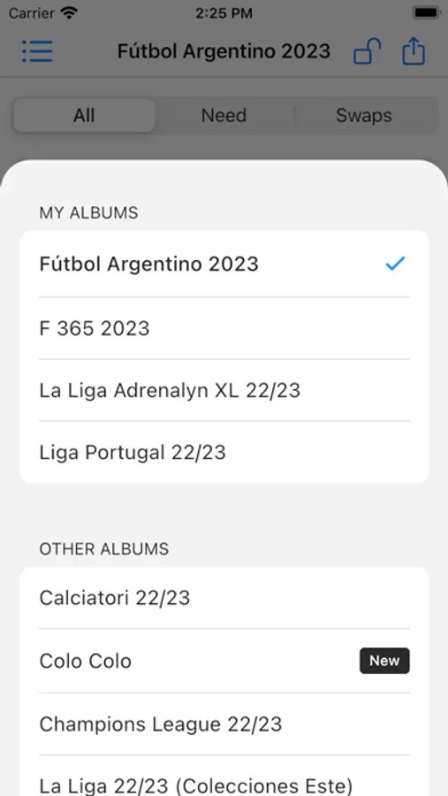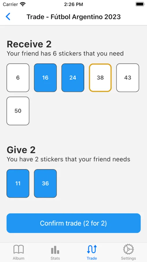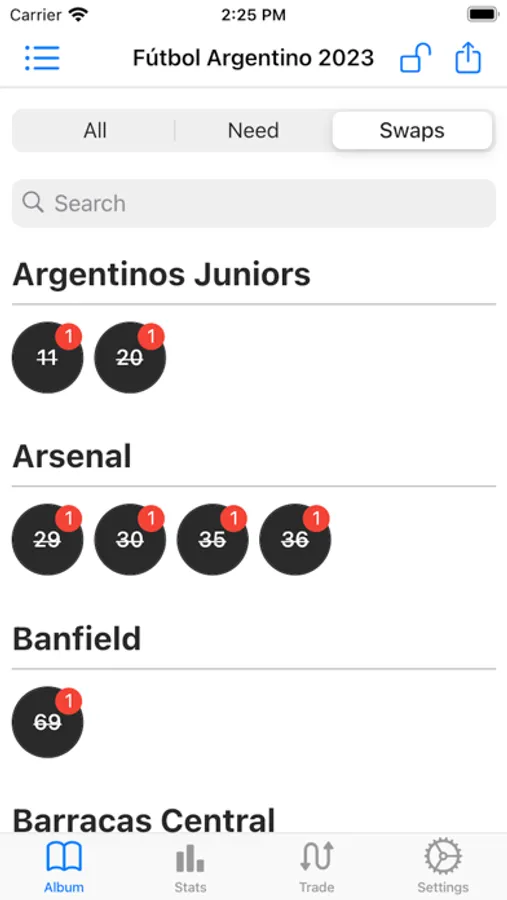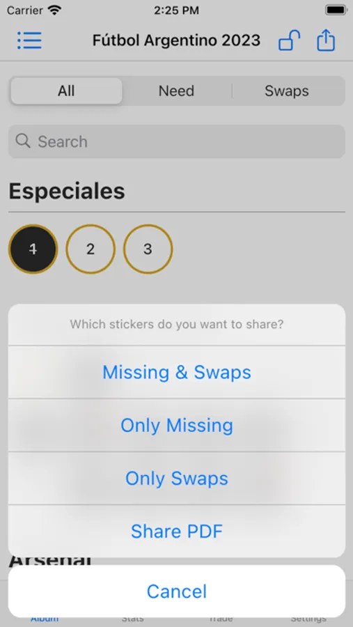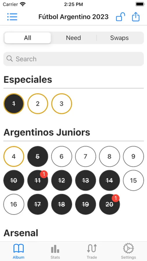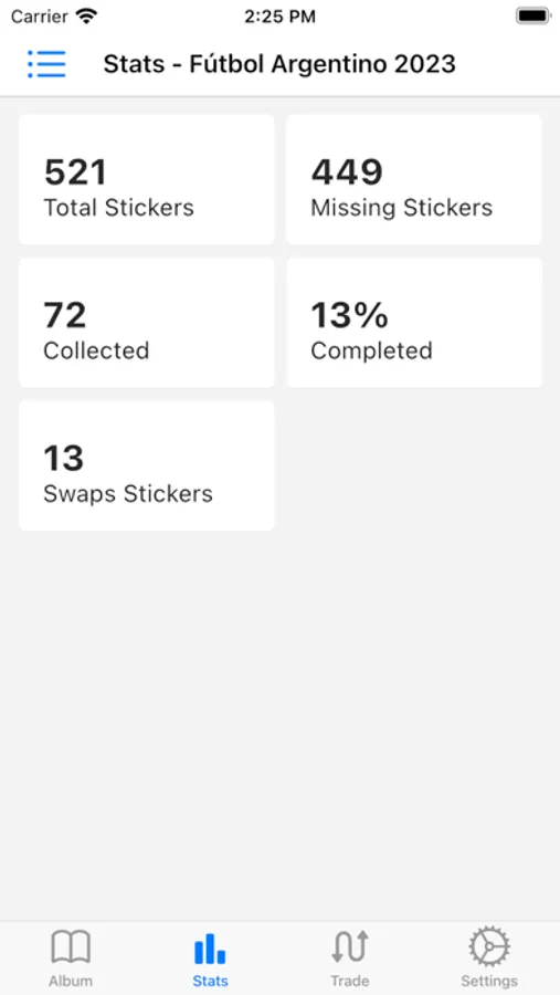 - Stats: check how many stickers you have and how many you need to complete each album.