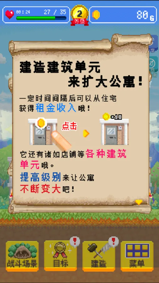 旅馆内可以增筑各类房屋和店面,素材可以去迷宫内欺负小怪获得!